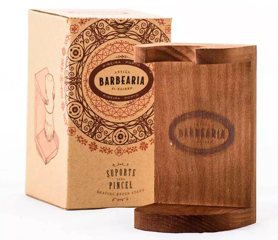Scheerkwasthouder, uitgevoerd in hout. Een must voor het behoud van de kwast waarvan de haren kunnen drogen, en een opgeruimde badkamer.